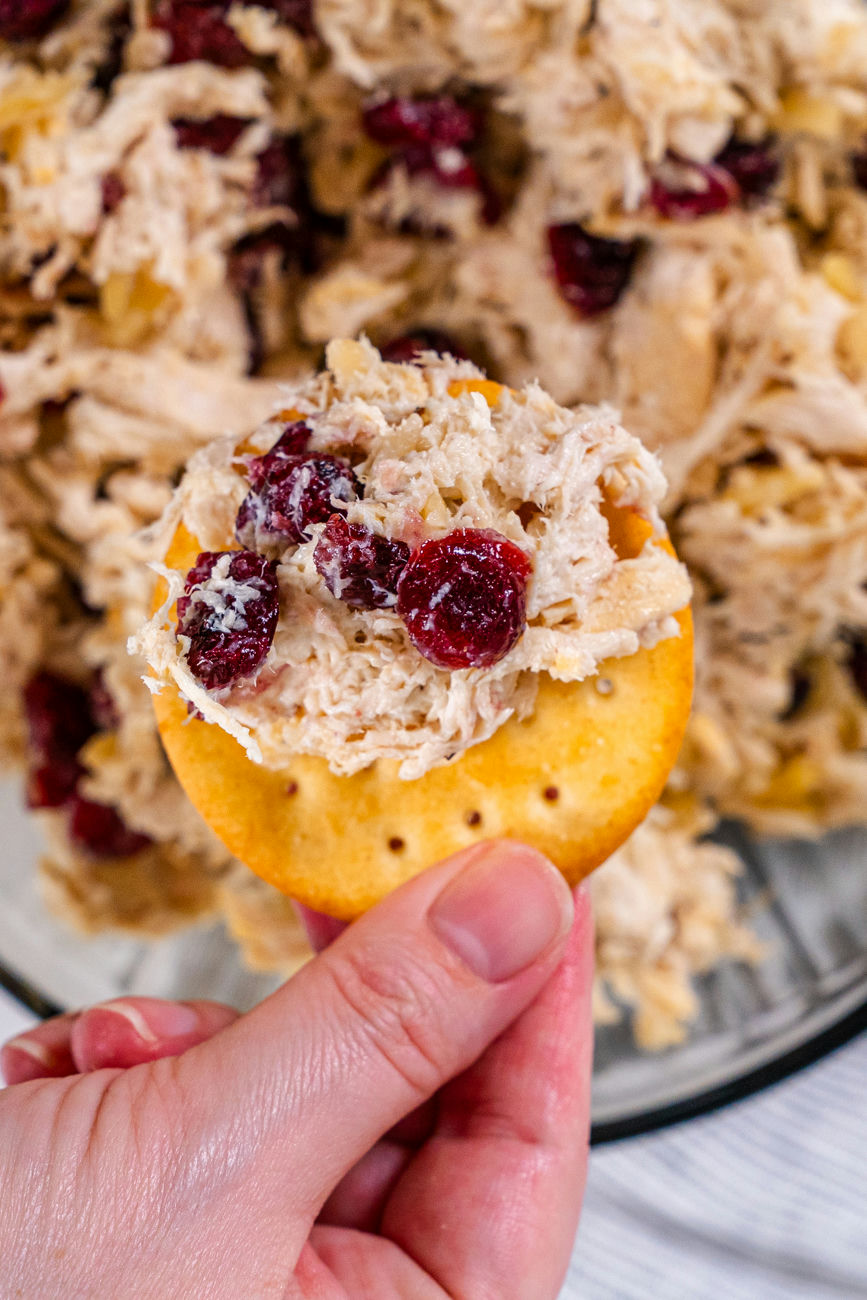 Then you simply shred that chicken up and mix it with the mayo, almonds, and dried cranberries. All that’s left to do is dig in.