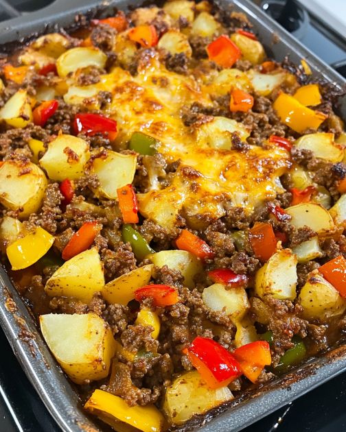 This cheesy beef and potato casserole is a comforting dish that brings back memories of family gatherings and Sunday dinners in the heart of the Midwest. It’s a recipe that has been passed down through generations, each adding their own touch to this hearty meal. The combination of ground beef, tender potatoes, and vibrant bell peppers, all topped with a golden layer of cheese, makes for a dish that’s both satisfying and nostalgic. Perfect for feeding a crowd or enjoying as leftovers, this casserole is a testament to the warmth and simplicity of traditional Midwestern cooking.