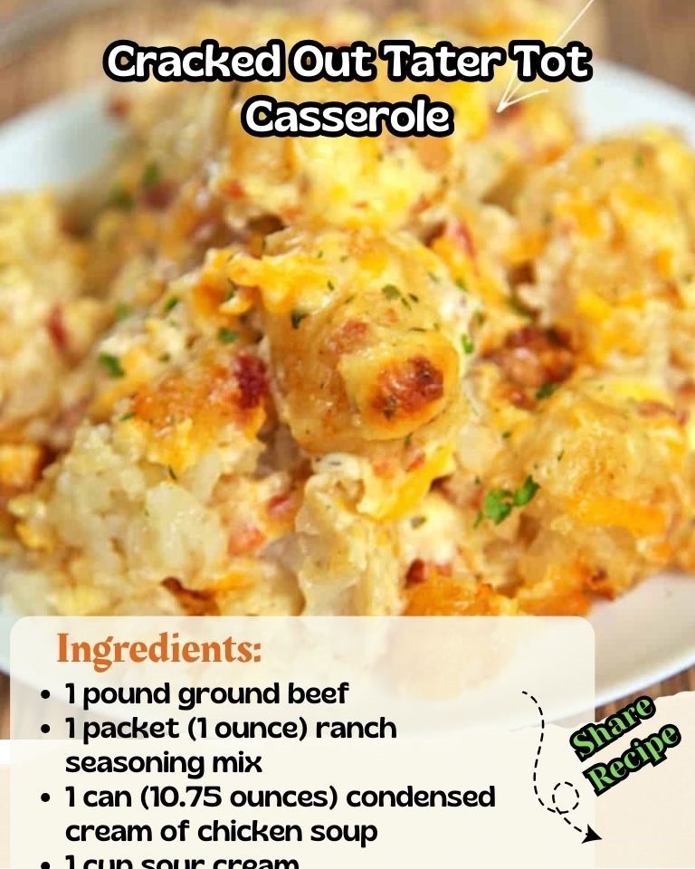 Cracked Out Tater Tot Casserole 😋🥘 Ingredients: – 1 pound ground beef – 1 packet (1 ounce) ranch seasoning mix – 1 can (10.75 ounces) condensed cream of chicken soup – 1 cup sour cream Read more