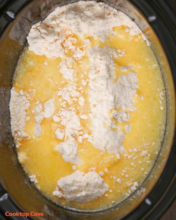 1. To make the dump cake, simply line the bottom of the slow cooker with a large can of cherry pie filling.