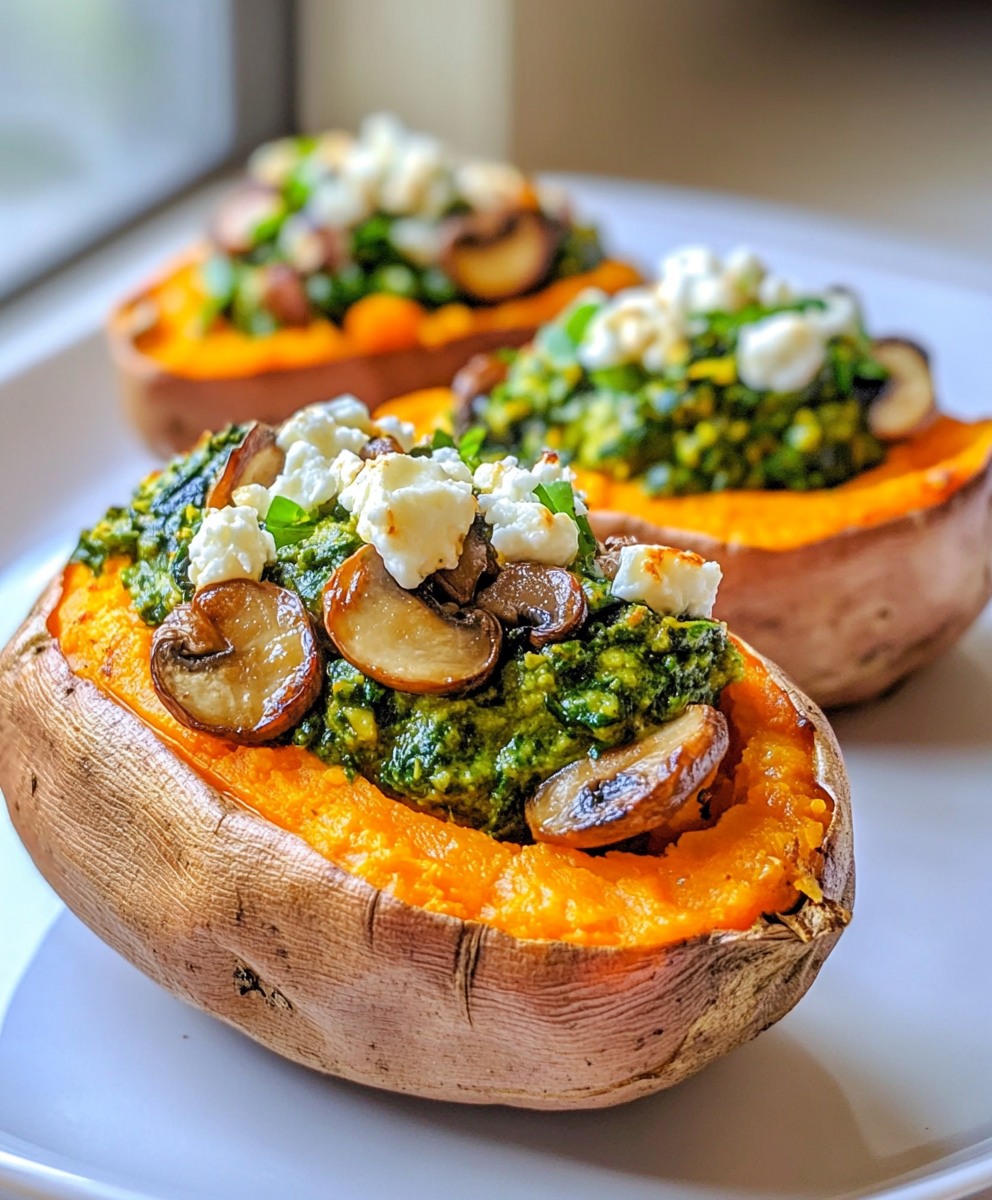 Today, I make these stuffed sweet potatoes when I want to feel grounded and nourished, when I want to serve something both beautiful and deeply satisfying. The tender sweetness of the potato, the earthy savoriness of sautéed mushrooms and wilted spinach, the salty tang of feta, and the herby kiss of fresh pesto—it’s the kind of dish that makes you close your eyes with the first bite.