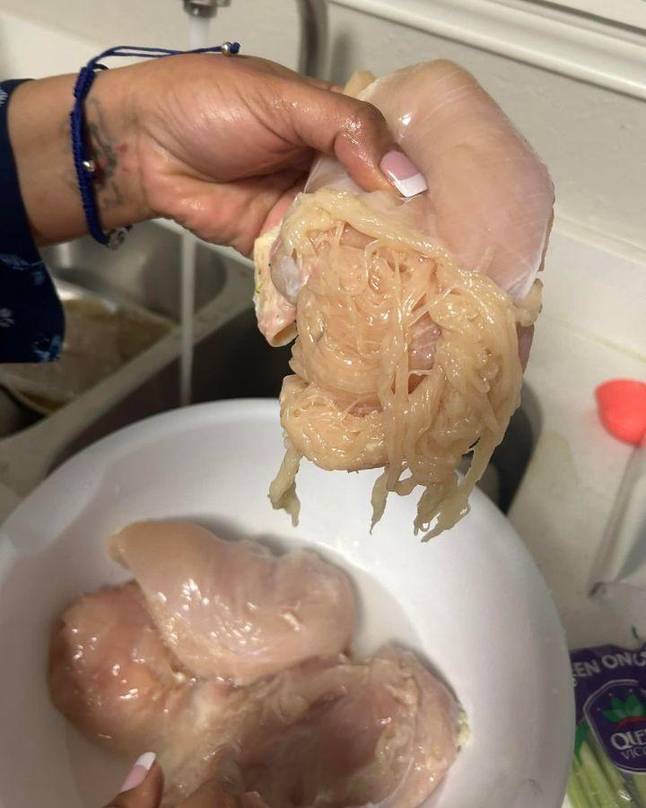 When consumers bring this chicken home and begin preparing it, the difference becomes obvious. As seen in the viral post, washing or handling the meat can cause it to shred into spaghetti-like strands. The texture can feel off-putting, but food safety experts maintain that the meat is still safe to eat. The visual and textural changes are purely cosmetic.