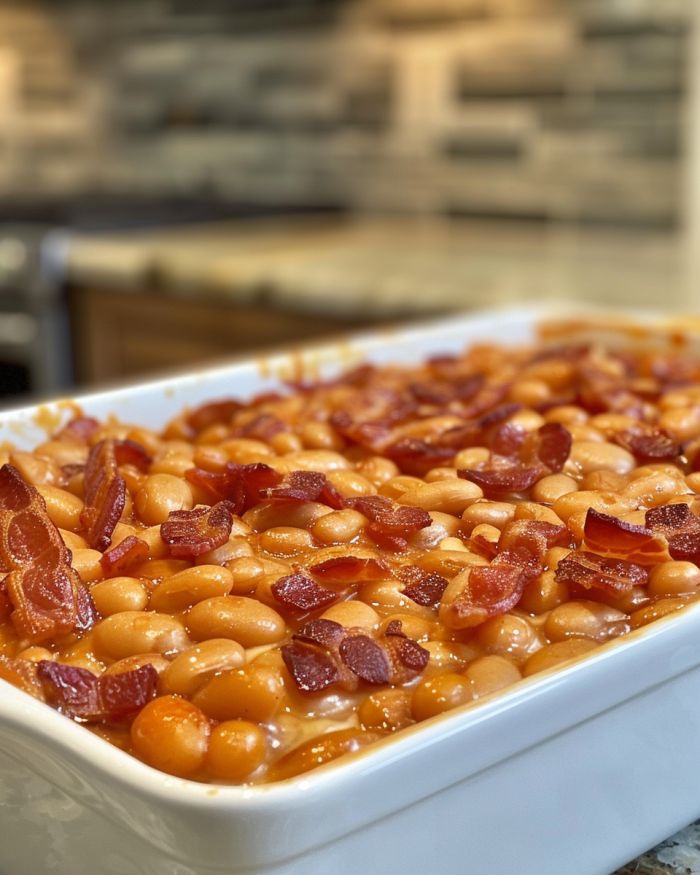 These sweet and savory baked beans go great with a variety of dishes. Serve them alongside grilled meats such as chicken, pork chops, or sausages. They also pair beautifully with coleslaw, cornbread, or a fresh green salad. For an all-around hearty meal, you might consider serving them as a side with hamburgers or hot dogs.