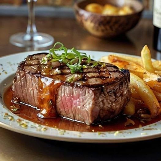 Try this Ribeye Steak with French onions and French fries, packed with rich flavors.
