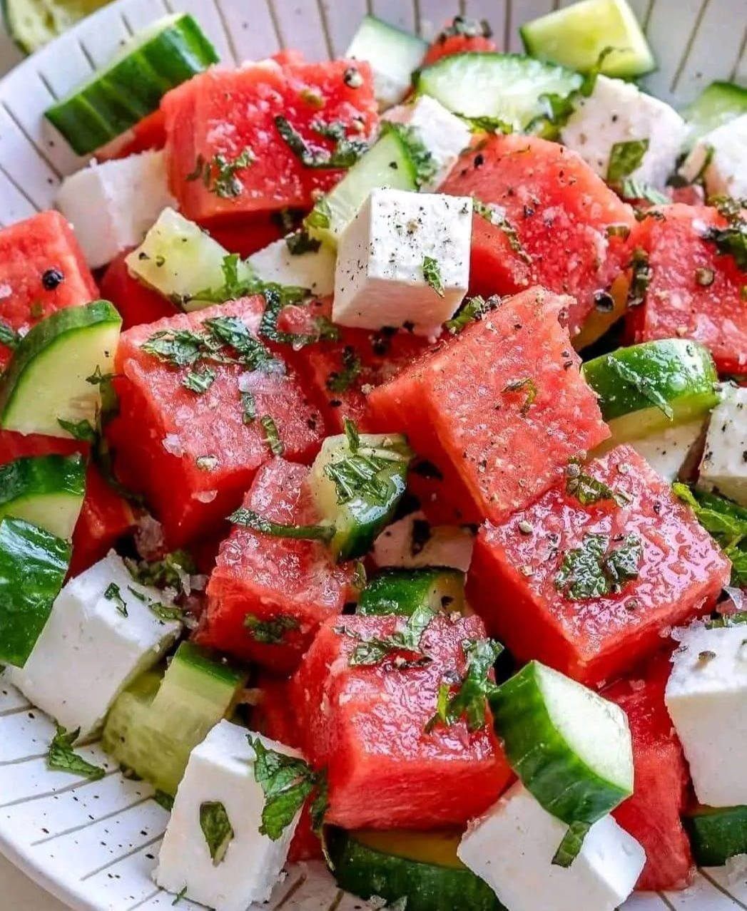 This refreshing, sweet, and savory dish is perfect for hot summer days. Juicy watermelon pairs beautifully with crisp cucumber, tangy feta cheese, and fresh mint, all tossed in a light citrus dressing.